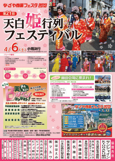 | ◆応募条件 | 名古屋市天白区在住、在学、在勤の方 ① お姫様:当日、衣装、かつらの用意をしています。 ② 忍者隊:当日、自前の衣装でお越しください。 ※飛び入り参加も受け付けますが、お申込頂ければ粗品をお渡しします。 ※天白姫に選ばれた方は、天白商店街の代表として、平成26年「名古屋まつり」のパレードに参加できます。 |
